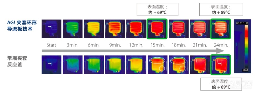 而AG!的環(huán)形導(dǎo)流板技術(shù)的解決了此問題。從左側(cè)的熱力圖可以清楚地看到,HTF“均勻”地分布在整個(gè)釜體夾套,沒有局部過熱/過冷,釜體溫度均一性良好。